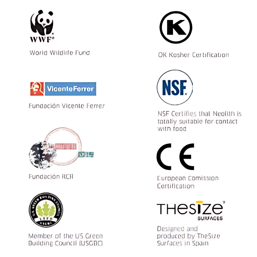 Đá NEOLITH đạt hàng loạt chứng nhận uy tín như ISO 9001, Greenguard, CE, NSF, cùng nhiều chứng chỉ đảm bảo an toàn sức khỏe, thân thiện môi trường và đáp ứng tiêu chuẩn khắt khe của châu Âu – Mỹ – Nhật.